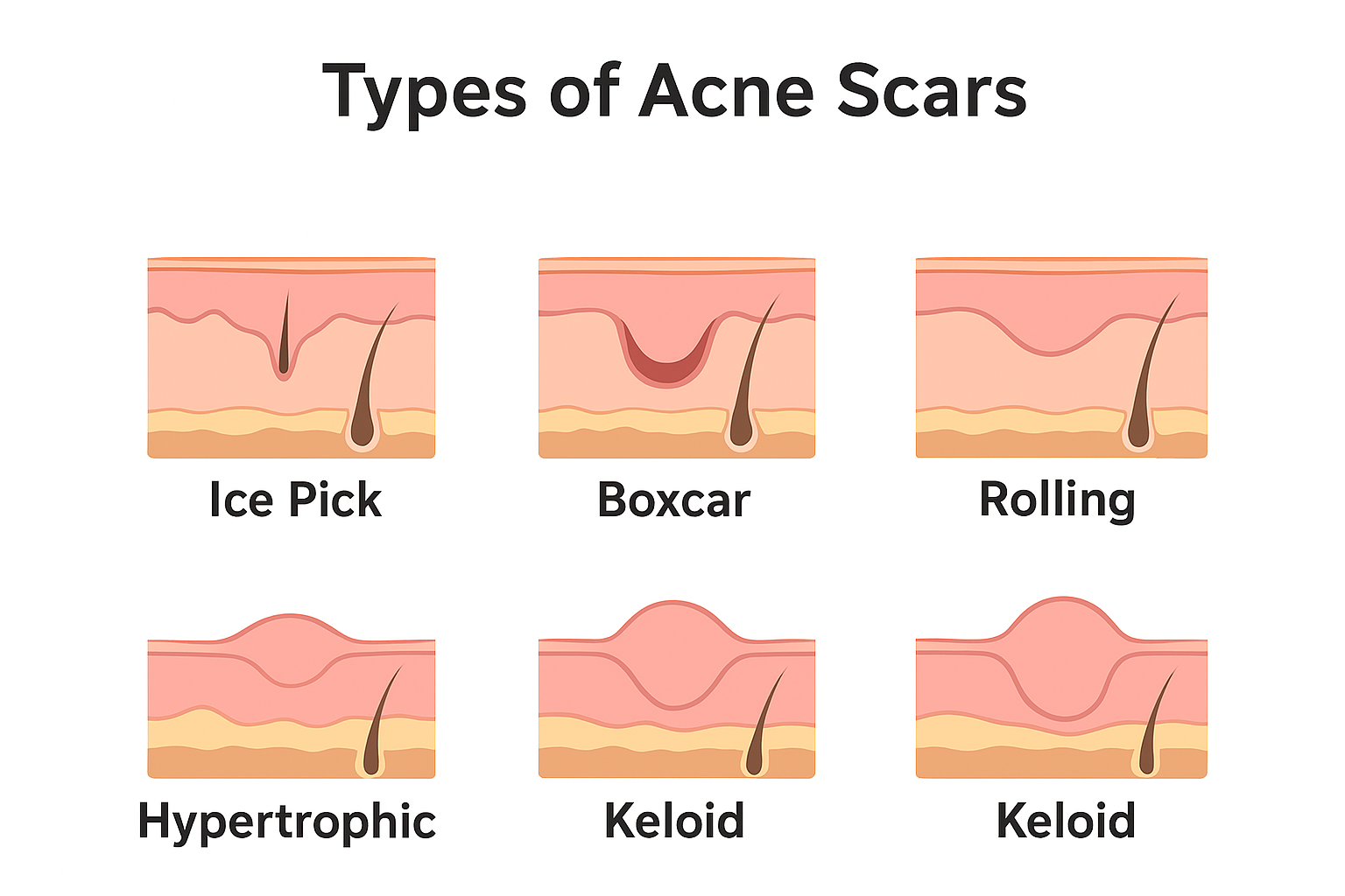 - کاهش تولید کلاژن → اسکارهای فرورفته (atrophic).